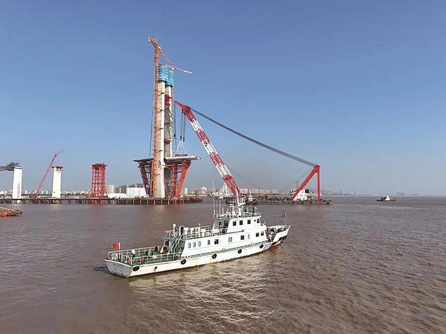 据介绍,其200米高的曲线H形钢筋混凝土主塔,搭配56对空间双索面斜拉索(单根最大长度245.976米、重量24.92吨),锚固系统采用气密设计保障长期安全;桥梁纵断面呈11.5‰的人字坡,变坡点设于中跨跨中,25000米的竖曲线半径对施工精度提出严苛要求。更具挑战的是,杭州湾作为世界三大强潮海湾之一,强潮、急流、台风频发,全年6级以上大风天数达180天,最大潮差近9米,复杂的海洋环境给施工安全与效率带来巨大考验。
